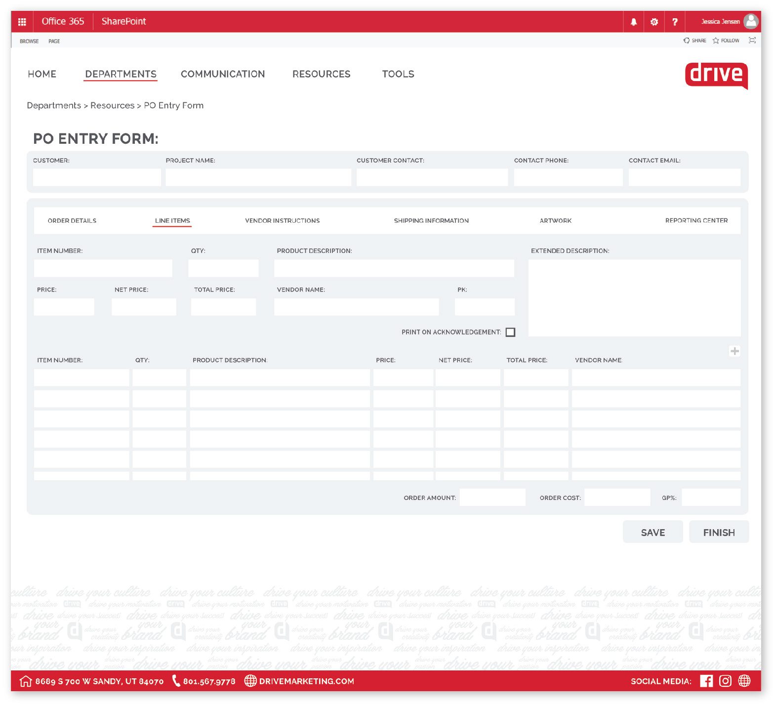 Drive Marketing located in Sandy, Utah, creates promotional, branded merchandise for corporations, events, or giveaways. While at Drive Marketing, I was tasked with creating a new project management platform. They needed a software that was easy to use and functional. Together with a team of department heads, I created a way to organize and manage the workload of an entire company with an intuitive interface that integrated with Microsoft SharePoint.